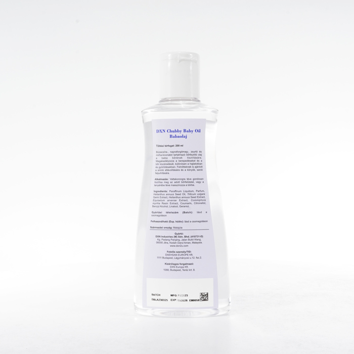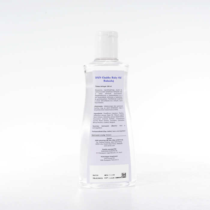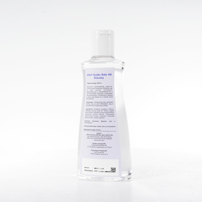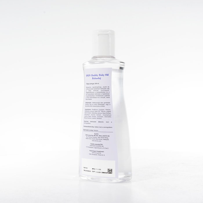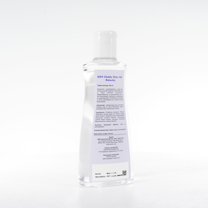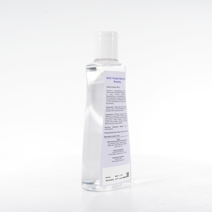 A DXN Chubby Baby Oil egy selymesen puha bőrkondicionáló, amelyet kifejezetten úgy fejlesztettek ki, hogy optimális nedvességet és védelmet biztosítson babája érzékeny bőrének. Gyengéd érintésével hatékonyan hidratálja és megóvja a bőrt a kiszáradástól, kirepedezéstől és hámlástól. Ezt a babaolajat úgy tervezték, hogy megőrizze a nedvességet, így a baba bőre ellenállhatatlanul puha, sima és táplált lesz egész nap. Ezenkívül smink eltávolítására is használható.